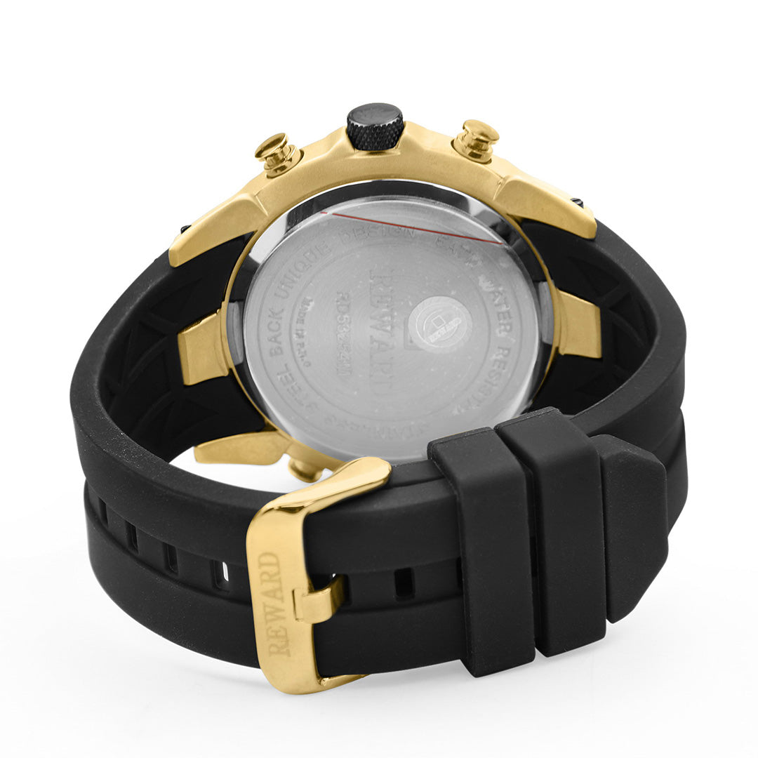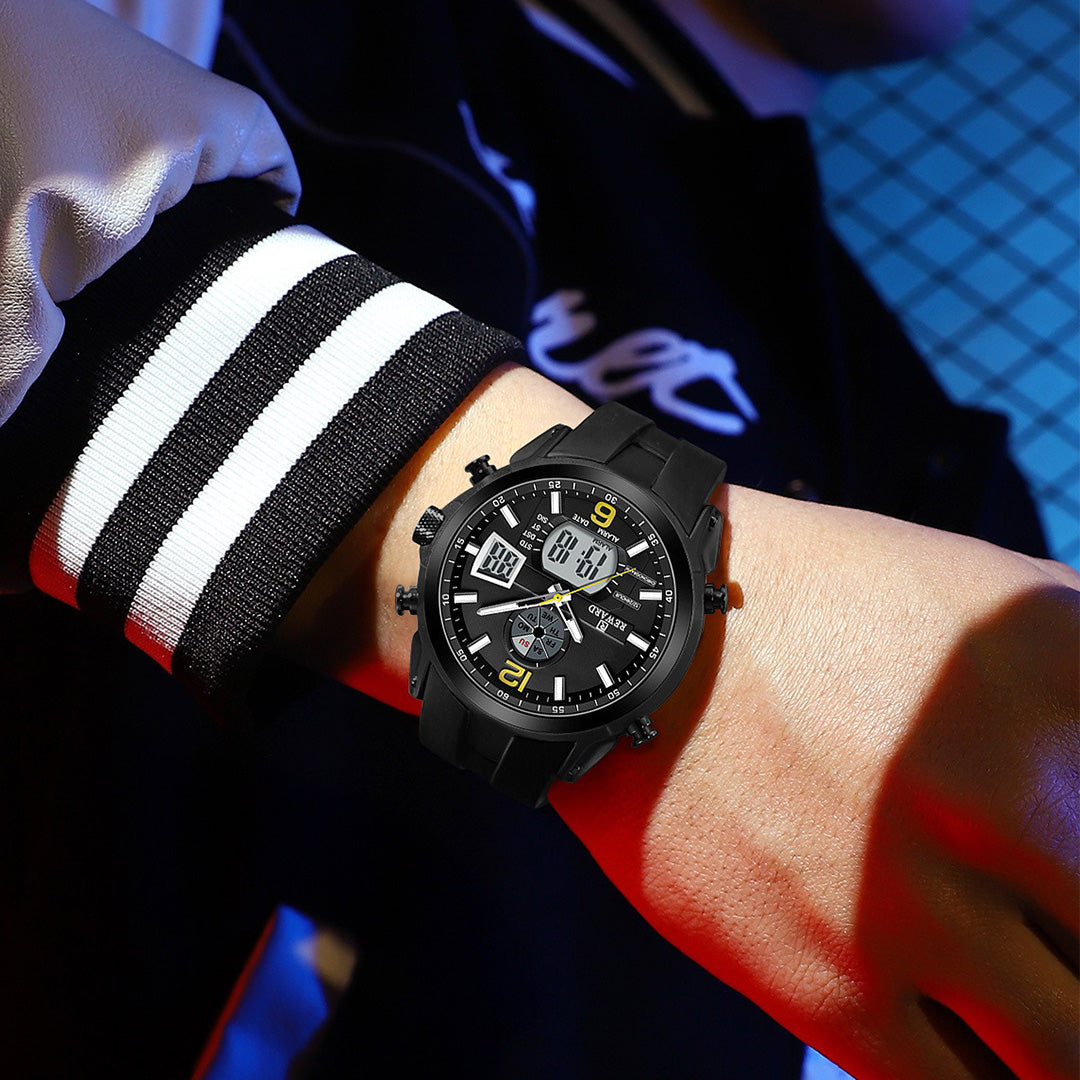 La Reward RD53254M associe affichage analogique et digital, mouvement quartz électronique précis, bracelet silicone confortable et fonctions pratiques : chronographe, alarme, double fuseau horaire et étanchéité 3ATM.