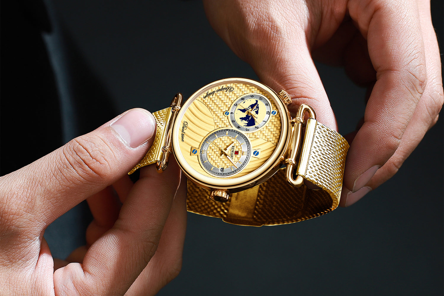 Montre REWARD RD62002M — luxe masculin, quartz double cadran japonais, fuseaux horaires multiples, design élégant, 3ATM waterproof.
