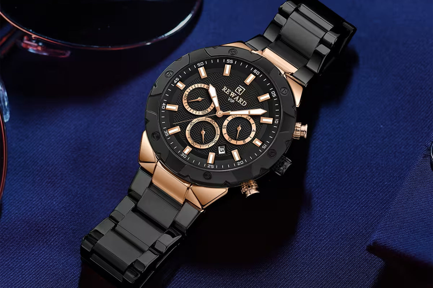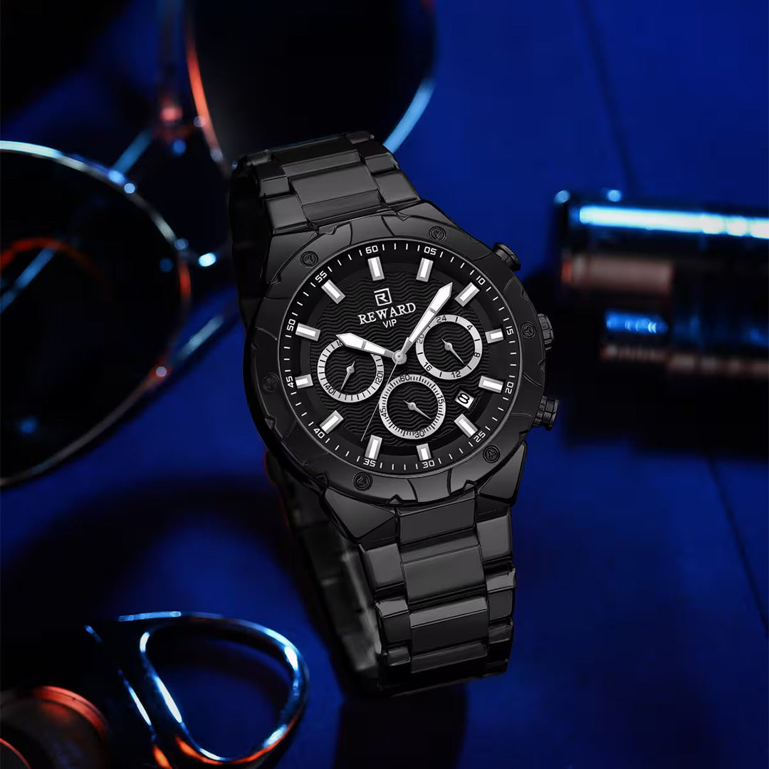 La Reward RD81970M associe luxe et fonctionnalité : chronographe quartz précis, bracelet acier inoxydable, étanchéité 3 ATM et affichage lumineux. Une montre VIP élégante et moderne.